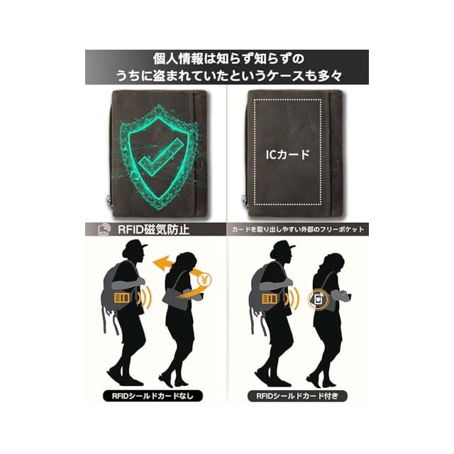 【RFIDを遮断する財布で安心です】 このときにうれしいのが、電子マネーの電波を遮断する財布です。電子マネーはRFIDと呼ばれる微弱な電波を使った通信で情報のやりとりをしています。このため、金属の入れ物に入れておけば外部から読み取られることはありません。でも、金属の入れ物だと持ち運びが大変であり、周りからやや冷たい視線を向けられることは確実です。今回、デザインも普通なの二つ折り財布なので、どのような格好でも似合います