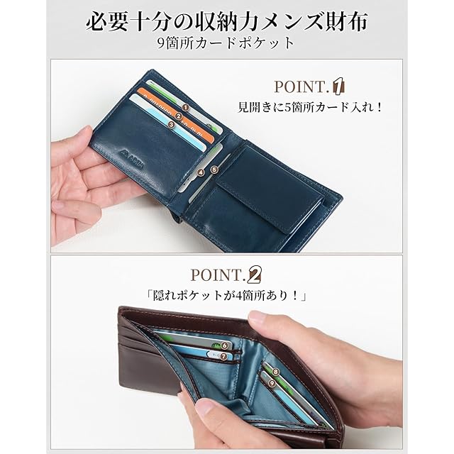 【使いやすい財布 メンズ】薄型でありながら大容量の小銭入れつきの二つ折り財布で、カード入れは9枚分つき。お札収納✕2ヵ所、小銭入れ✕1ヵ所 。レシートやチケットなどの収納までも、いつでも綺麗に整理できます。財布のサイズは11×9×1.3cmで、コンパクトサイズなのでポケットにすっきりと収まり、重さはわずか70gで持ち運びに便利です。使いやすいボックス型の小銭入れは、 取り付け位置に工夫することで、 一目で見やすく、取りだしやすくなりました。