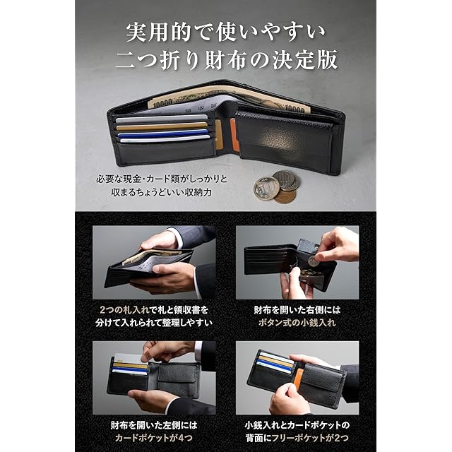 【実用的で使いやすい二つ折り財布の決定版】2つの札入れで札と領収書を分けて入れられて整理しやすいです。財布を開いた右側にはボタン式の小銭入れ、左側にはカードポケットが4つあり、小銭入れとカードポケットの背面にフリーポケットが2つあります。必要な現金・カード類がしっかりと収まるちょうどいい収納力です。