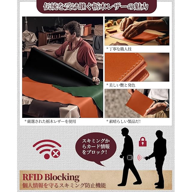 ✅【革の芸術品 栃木レザー財布】厳選された栃木県産皮革を贅沢に使用した二つ折り財布。職人による伝統的な鞣し技術で生まれる深みのあるシボと、時間と共に味わい深く変化する「経年美化」が特徴です。ビジネスシーンにも映える、本物の皮革が持つ品格です。