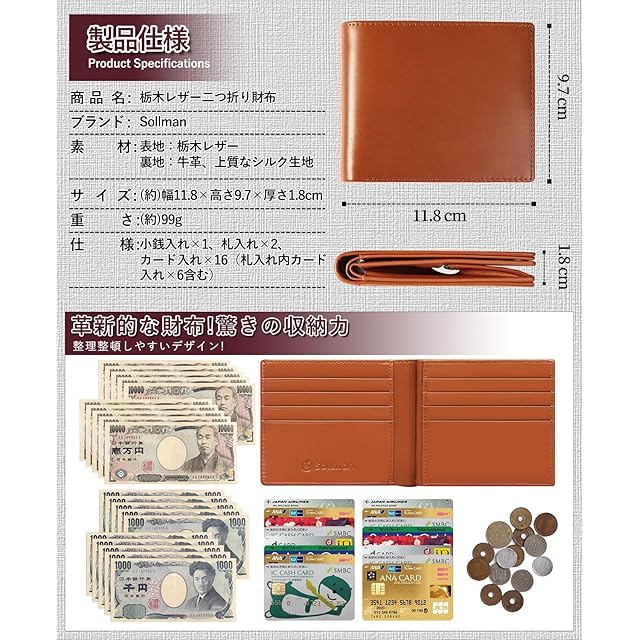 ✅【抜群の収納力、使いやすい、安心感!】カードポケット16箇所、札入れ2箇所を備え、高い収納効率を実現。お札・レシート・領収書・切符・チケット等マルチ収納が可能な栃木レザー二つ折り財布です。コインポケットはガバッと開くBOX型を採用。取り出しやすい設計なので会計時にレジ横で活躍します。ボタンは日本製THK社を採用した本革二つ折り財布です。