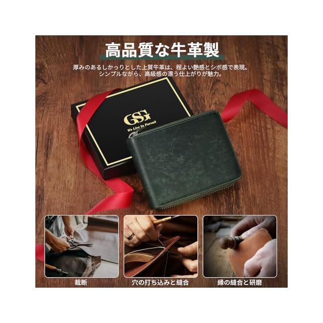 《新品未開封》[GSG] 財布 メンズ 2つ折り 人気 ブランド 本革 ラウンドファスナー 折りたたみ ボックスの小銭入れ コンパクト 小さい 牛革 大容量 プレゼント グリーン+ブラウン 24022