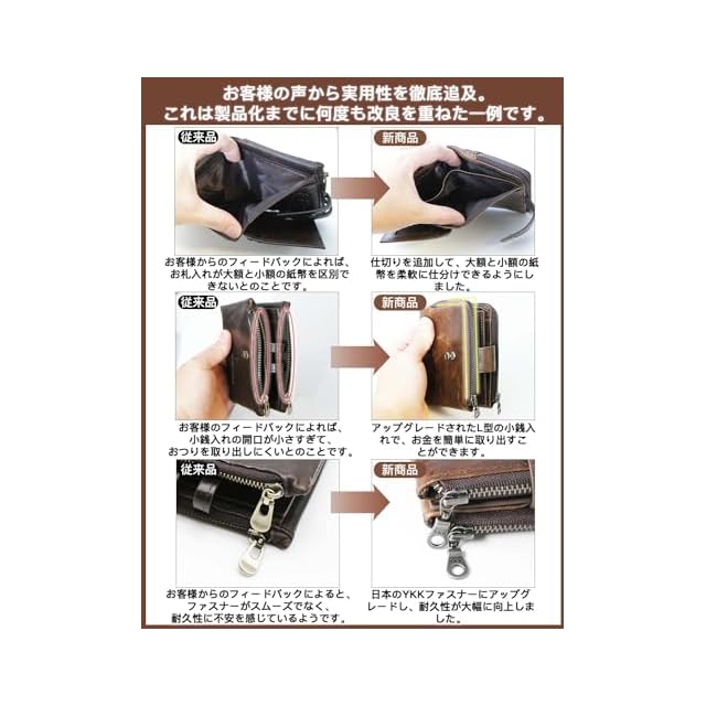 【高級ファスナー&YKK社製】お客様からのご意見をもとに、革職人と協力して大容量タイプを維持しつつ、二つ折り財布の小銭入れファスナーをYKKファスナーにアップグレードし、使いやすさにこだわった財布にリニューアルしました。高品質なファスナーを採用し、スムーズな開閉が可能です。また、小銭の種類を見分けやすいように、2つのポケットの小銭入れに変更しました。YKK製のファスナーをはじめ、膨らみにくく取り出しやすい小銭入れ、出し入れしやすいカードポケットなど、素材に加えて使い勝手も抜群です。メンズの2つ折り財布として、高い品質をお求めの方におすすめです