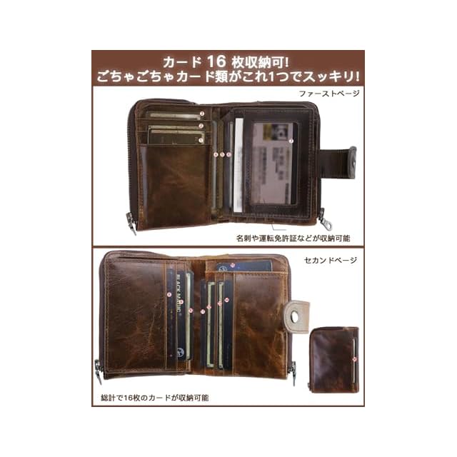 【大容量の収納スペース】このメンズ2つ折り財布は、大容量の収納スペースを備えており、カードや小銭をたっぷり収納できます。財布のフォルムを崩すことなく、お札入れx2、小銭入れx2、カードポケットx16、外側ポケットx1を備えています。収納可能サイズは各種ギフト券、スマートフォン、通帳、パスポート等で、全ての個所にカードを入れても全然厚みが変わらないのも魅力的なポイントです。本体重量は約118gで、本体サイズは12.2cmx9.6cmx3cmです