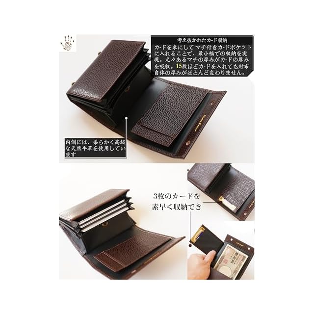 【サイズと容量】幅10.8cm / 高さ8.6cm / 厚み2.7cm。3つの大容量カードスロットと2つの便利なアクセスカードスロットを持ってい。小銭袋は箱型で硬貨を出し入れしやすいようになっています。カード15枚,コイン15~20枚,紙幣20枚を収納でき