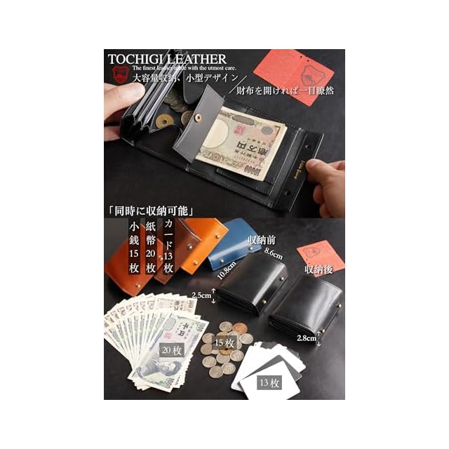 【サイズと容量】幅10.8cm / 高さ8.6cm / 厚み2.5cm。3つの大容量カードスロットと2つの便利なアクセスカードスロットを持ってい。小銭袋は箱型で硬貨を出し入れしやすいようになっています。カード15枚,コイン15~20枚,紙幣20枚を収納でき