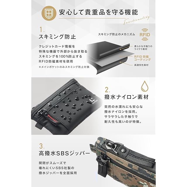 【他にはないセキュリティ性】: 海外旅行中のスリやスキミング対策に、メインポケットにスキミング防止機能を搭載。付属のブラックキーチェーンでパンツのフックに固定でき、引っ張られても簡単に盗られない安心設計。 【突然の水濡れも安心】: 撥水加工ナイロンとSBS防水ジッパーで、急な雨や水濡れから中身をしっかりガード。耐久性も高く、開閉もスムーズに。