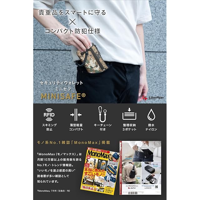 《新品未開封》[LiberFlyer] 雑誌MonoMax掲載 MINISAFE ミニセフ 防犯ミニマムデザイン×スキミング防止 海外旅行 ミニ 財布 旅行 薄型 撥水 小銭入れ メンズ レディース 取り外し可能 キーチェーン 付き (新素材モデル(Camoグリーン))