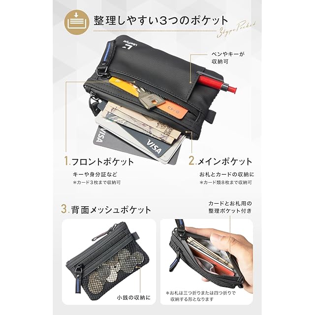 商品名:《新品未開封》[LiberFlyer] [公式] 【雑誌MonoMax掲載】MINISAFE ミニセフ 防犯ミニマムデザイン×スキミング防止 海外旅行 ミニ 財布 旅行 薄型 撥水 小銭入れ メンズ レディース 取り外し可能 キーチェーン 付き (新素材モデル(Black青ジッパー))