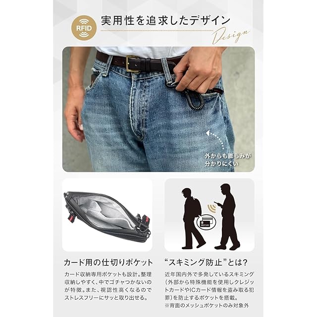 【他にはないセキュリティ性】: 海外旅行中のスリやスキミング対策に、メインポケットにスキミング防止機能を搭載。付属のブラックキーチェーンでパンツのフックに固定でき、引っ張られても簡単に盗られない安心設計。 【突然の水濡れも安心】: 撥水加工ナイロンとYKK防水ジッパーで、急な雨や水濡れから中身をしっかりガード。耐久性も高く、開閉もスムーズに。