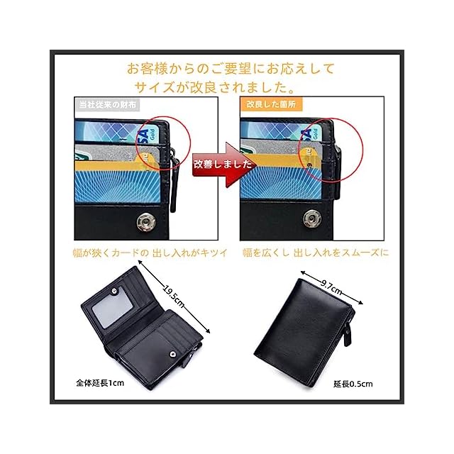 【商品仕様】(折りたたみ時):12cm×9.7cm×厚さ2.5cm カラー:ブラック、 オレンジ、レッド、ブルー ○素材:カーボンレザー(牛革)、マイクロファイバー。クレジットカード入れ×10、お札入れ×2、小銭入れ×2、フリーポケット×1、IDウィンドウ×1。