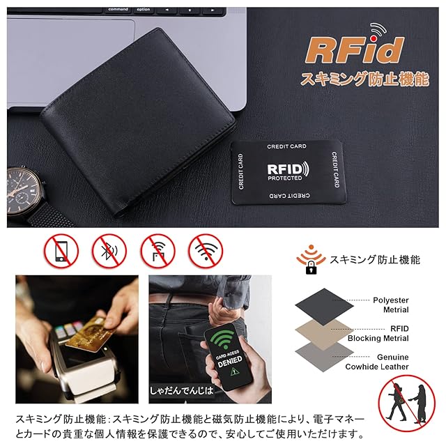 【ポイント4-スキミング防止機能】:スキミング防止機能と磁気防止機能により、電子マネーとカードの貴重な個人情報を保護できるので、安心してご使用いただけます。財布専用箱が付きますので、プレゼントにも最適です!