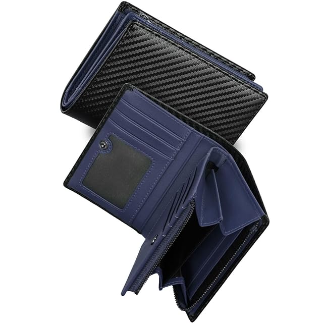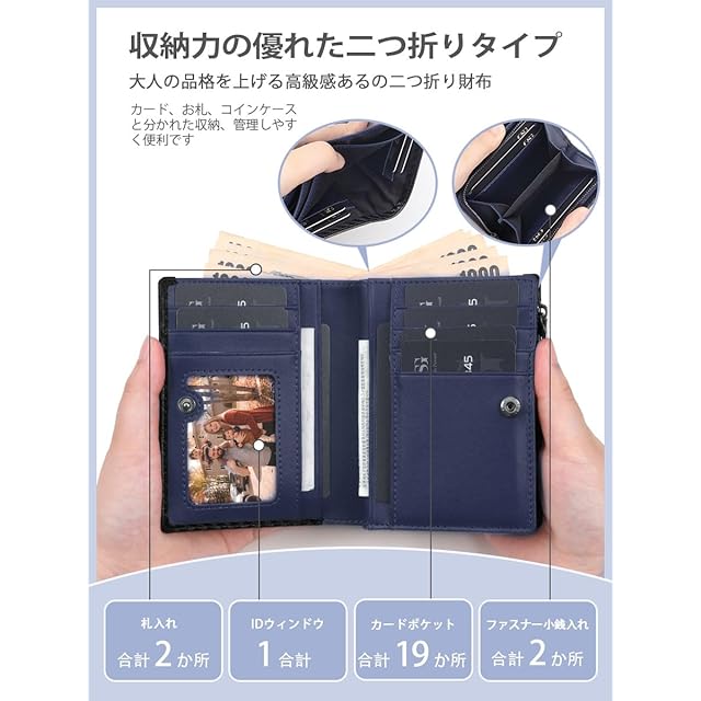 【財布 メンズ 2つ折り-商品説明】:(カラー):ブラック&ブルー;(サイズ):約12.2*9.7*2.5cm;(仕様):カード入れx19( IDウィンドウ×1)(フリーポケット ×4)、札入れx2、L字型ファスナー小銭入れ× 1(仕切りある);職人がひとつひとつ丁寧に製作いたしまいした二つ折り財布メンズが登場。