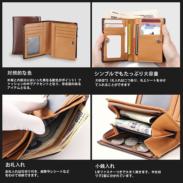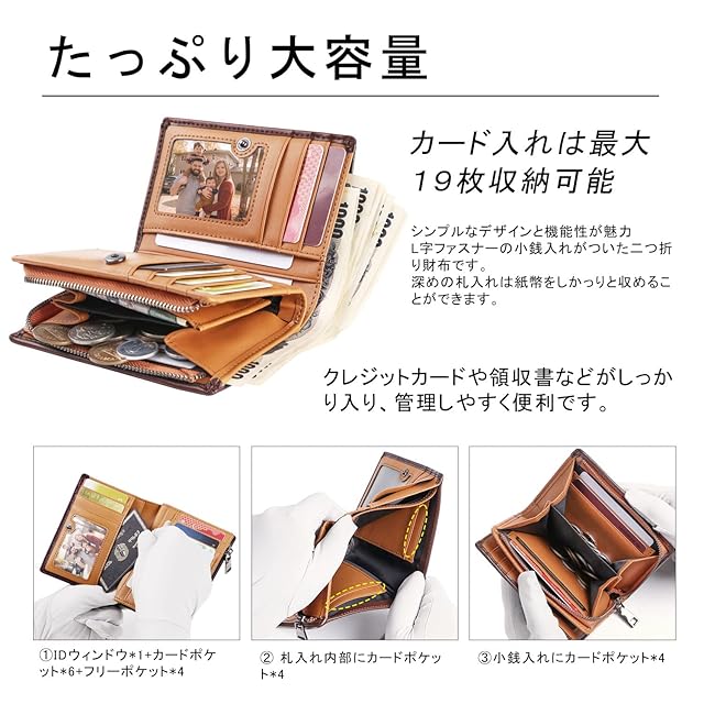 【財布 コンパクト 大容量で、収納抜群】:カード、お札、コインケースと分かれた収納は、クレジットカードや領収書などがしっかり入り、管理しやすく便利です。L字型ファスナー式小銭入れで、コインの出し入れはしやすいです。
