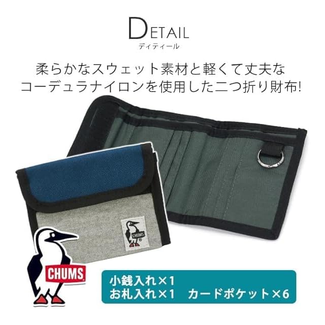 生地の表面に撥水、撥油、防汚性能を持った「Asahi Guard E-SERIES」加工剤を採用し、水や汚れに強いスウェットナイロンシリーズの財布。<BR><BR> 柔らかなスウェットをメインに、負荷が多くかかる箇所にはナイロンを合わせた人気のシリーズです。<BR><BR> チャムス定番のお財布。