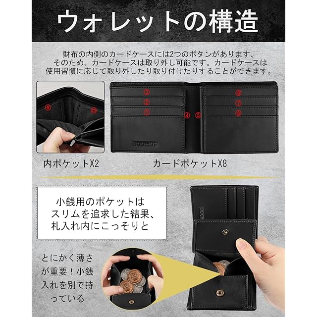 ✅『 財布スペック』サイズ : 11.5㎝ × 9.5㎝ × 2㎝、重量:約100g。収納:札入れ×2、BOX型小銭入れ×1、カード入れ×10。