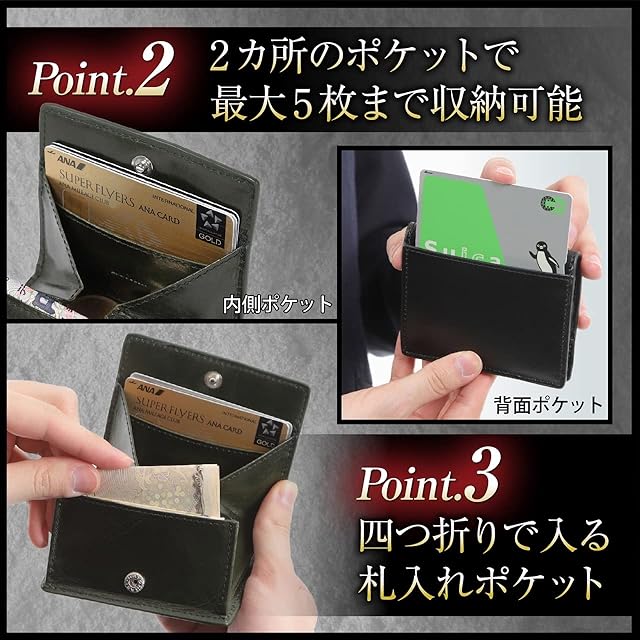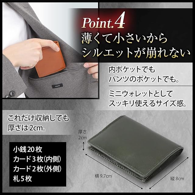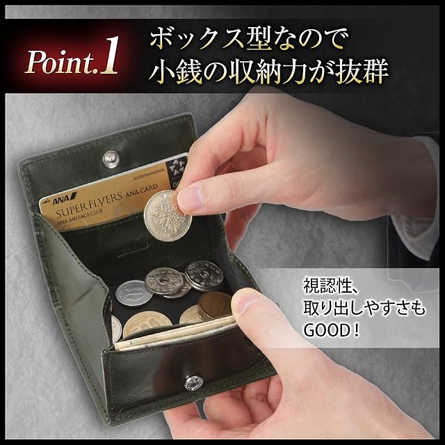 【小さい財布を使っている300人の声から誕生】<BR> 求める機能 No.1 小銭入れ、No.2 小クレジットカード、カード入れ、No.3 紙幣、札入れ<BR><BR> 【ボックス型なので小銭の収納力が抜群】<BR> 視認性、取り出しやすさも兼ね備えた機能です。<BR><BR> 【2カ所のカード入れ】<BR> 内側に3枚、背面に2枚、最大5枚のカードが収納できます。<BR> 普段使いのクレジットカード、交通系カード、免許証、保険証、普段使いの最小限なら5枚収納でOK!<BR><BR> 【札入れも可能】<BR> 札は4つ折りで入るポケットがあります。<BR> 小銭、カード、札が入るオールインワン型のミニ財布、ミニウォレットです。<BR><BR> 【薄くて、コンパクト】<BR> 薄くて小さいからスーツの内ポケットに入れても、パンツのポケットに入れてもシルエットが崩れません。<BR><BR> 【ワンランク上の高級本革仕様】<BR> 革は牛革。植物タンニン鞣しの高級本革なので経年変化も楽しめます。<BR><BR> 【カラー】ブラック/ダークブラウン/ダークグリーン/キャメル<BR><BR> 【サイズ】約9.7×8.0×2.0cm<BR><BR> 【贈り物にも最適です】<BR> 化粧箱に入れてしますので大切な方への贈り物にもどうぞ。<BR> 就職祝い、入学祝、父の日、母の日、誕生日、クリスマスプレゼント、バレンタインデー、ホワイトデー等、あらゆる場面での贈り物として喜ばれています。