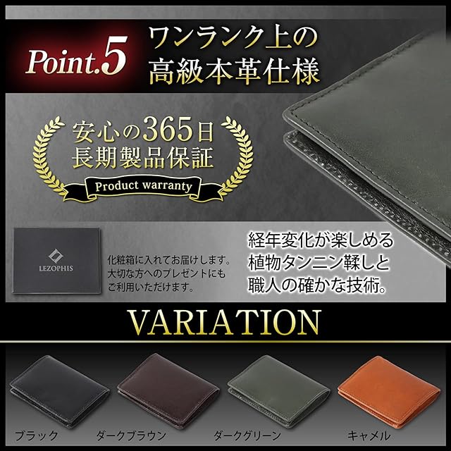 【小さい財布を使っている300人の声から誕生】<BR> 求める機能 No.1 小銭入れ、No.2 小クレジットカード、カード入れ、No.3 紙幣、札入れ<BR><BR> 【ボックス型なので小銭の収納力が抜群】<BR> 視認性、取り出しやすさも兼ね備えた機能です。<BR><BR> 【2カ所のカード入れ】<BR> 内側に3枚、背面に2枚、最大5枚のカードが収納できます。<BR> 普段使いのクレジットカード、交通系カード、免許証、保険証、普段使いの最小限なら5枚収納でOK!<BR><BR> 【札入れも可能】<BR> 札は4つ折りで入るポケットがあります。<BR> 小銭、カード、札が入るオールインワン型のミニ財布、ミニウォレットです。<BR><BR> 【薄くて、コンパクト】<BR> 薄くて小さいからスーツの内ポケットに入れても、パンツのポケットに入れてもシルエットが崩れません。<BR><BR> 【ワンランク上の高級本革仕様】<BR> 革は牛革。植物タンニン鞣しの高級本革なので経年変化も楽しめます。<BR><BR> 【カラー】ブラック/ダークブラウン/ダークグリーン/キャメル<BR><BR> 【サイズ】約9.7×8.0×2.0cm<BR><BR> 【贈り物にも最適です】<BR> 化粧箱に入れてしますので大切な方への贈り物にもどうぞ。<BR> 就職祝い、入学祝、父の日、母の日、誕生日、クリスマスプレゼント、バレンタインデー、ホワイトデー等、あらゆる場面での贈り物として喜ばれています。