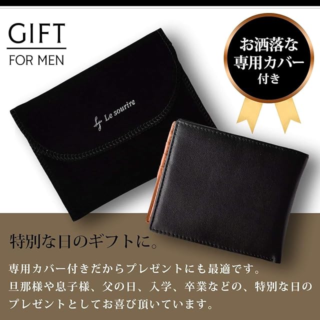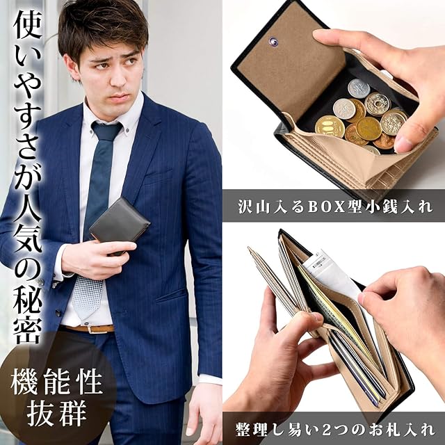 商品名:《新品未開封》[Le sourire] 二つ折り 財布 カード18枚収納 ボックス型小銭入れ 本革 メンズ (ブラックxベージュ)