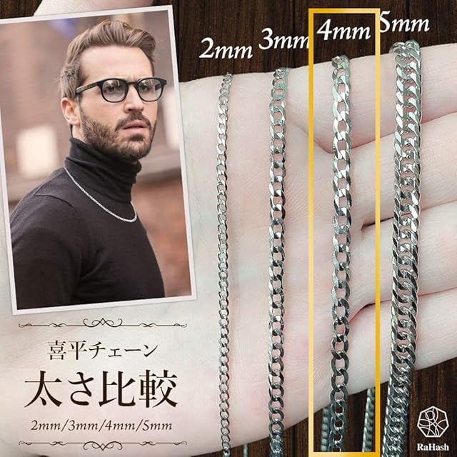 《新品未開封》[RaHash] ネックレス チェーン メンズ 喜平 シルバー 925 ブランド [ 銀 6面カット 幅4mm ] [ 45cm ]