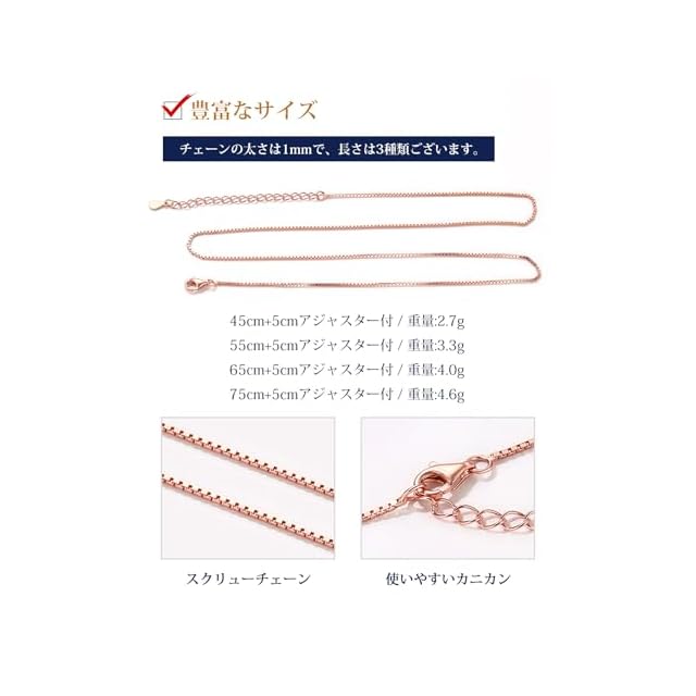 [定番の3色展開] 番で人気の3色よりお選びくださいませ。シャープな印象のシルバーネックレスチェーンはカジュアルスタイルに、キラキラ華やかなゴールドックレスチェーンはパーディーシーンに、やさしく女性らしいピンクゴールドックレスチェーンはワンピースたスカートスタイルにお使いいただけます。
