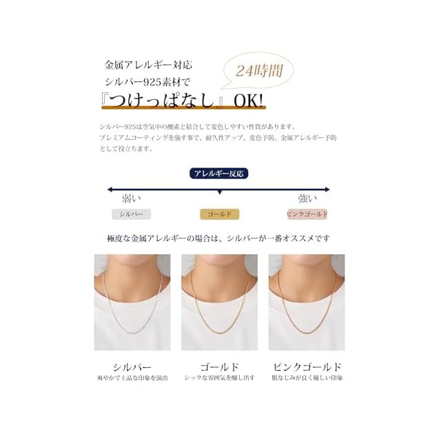 [定番の3色展開] 番で人気の3色よりお選びくださいませ。シャープな印象のシルバーネックレスチェーンはカジュアルスタイルに、キラキラ華やかなゴールドックレスチェーンはパーディーシーンに、やさしく女性らしいピンクゴールドックレスチェーンはワンピースたスカートスタイルにお使いいただけます。