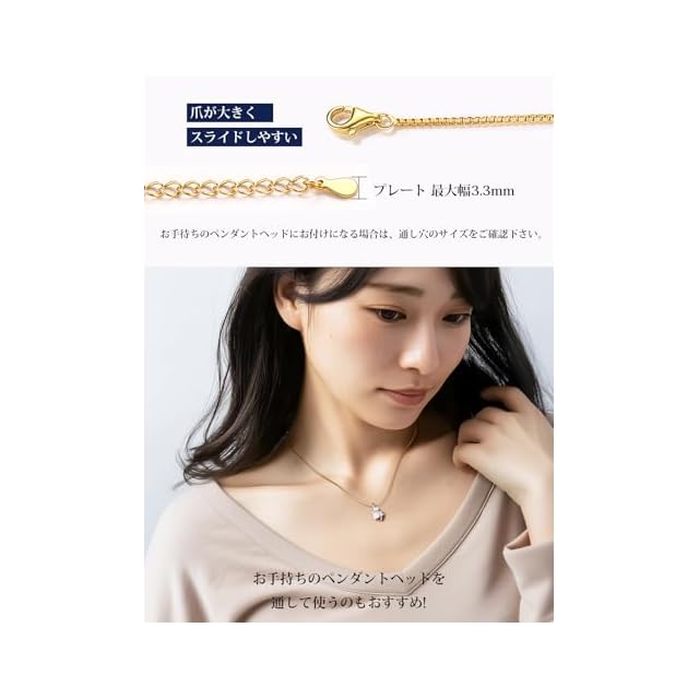 [定番の3色展開] 番で人気の3色よりお選びくださいませ。シャープな印象のシルバーネックレスチェーンはカジュアルスタイルに、キラキラ華やかなゴールドックレスチェーンはパーディーシーンに、やさしく女性らしいピンクゴールドックレスチェーンはワンピースたスカートスタイルにお使いいただけます。