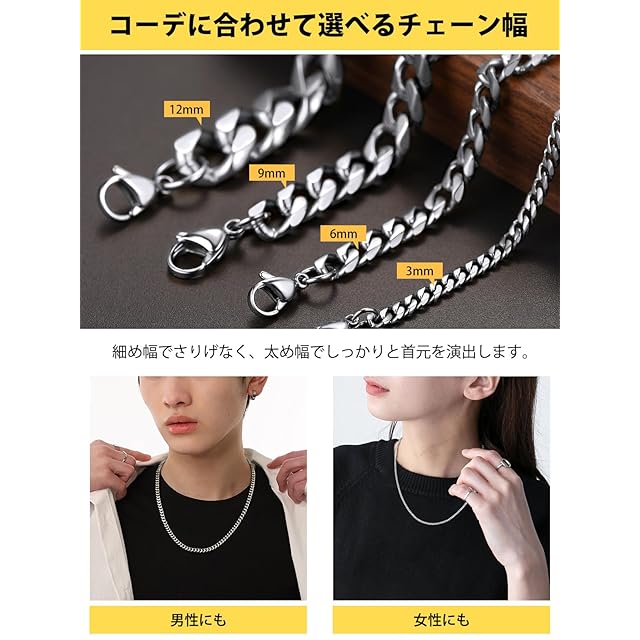 【色も!太さも!長さも選べる!】3mm、6mm、9mm、12mmの4太さ、シルバー、ゴールド、ブラックの3色、46cm、51cm、56cm、61cm、66cm、71cm、76cmの7長さ、全84種類を揃えました!