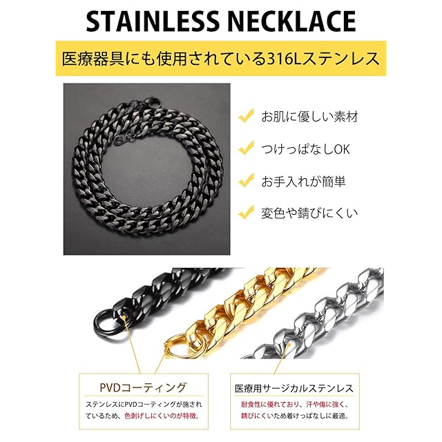 商品名:《新品未開封》[ChainsHouse] ネックレス メンズ チェーンのみ サージカルステンレス 喜平 金属アレルギー ブラック 黒 61cm 9mm アクセサリー