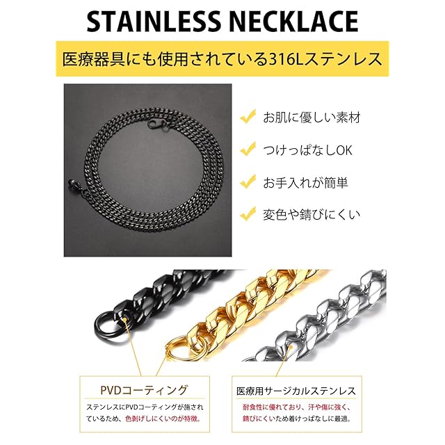 《新品未開封》[ChainsHouse] ネックレス メンズ チェーンのみ サージカルステンレス 喜平 金属アレルギー ブラック 黒 51cm 3mm アクセサリー