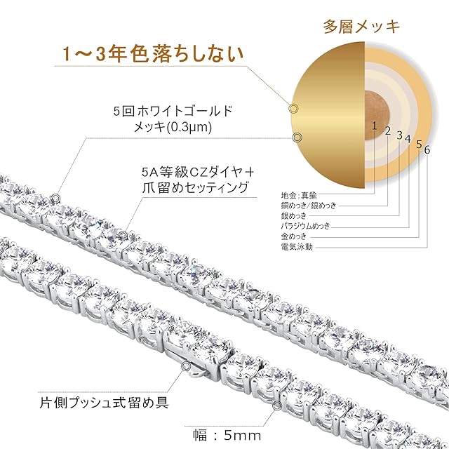 【しっかりした作り】素材は展延性に優れる真鍮とホワイトゴールドのメッキ加工。5回もメッキ(0.3μm)をかけているため、耐食性にも優れ、汗などの影響を受けにくく、日常使用ではほとんど黒ずみや変色の心配はありません。