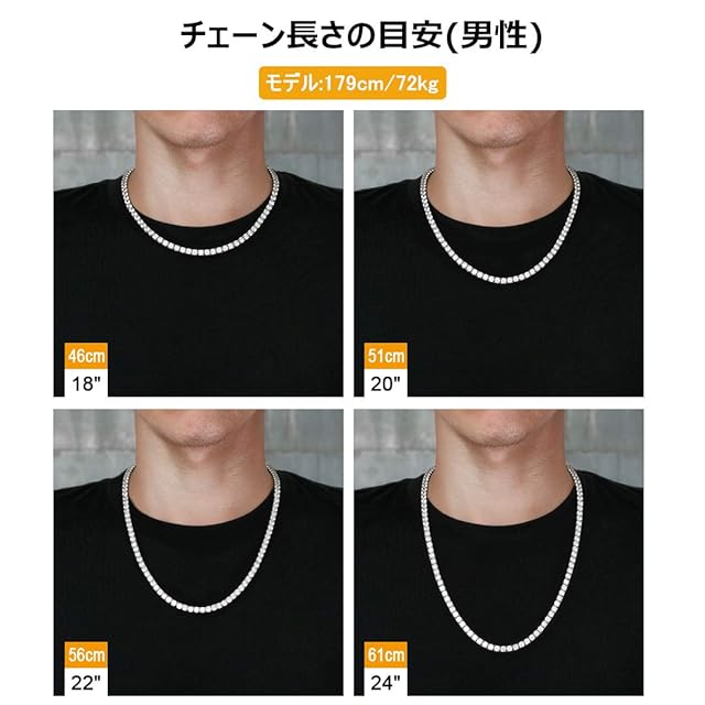 【手作業による爪留め】5A等級の大粒CZダイヤを使用することで、通常のテニスチェーンより輝きが増します。ストーンは1粒1粒ジュエラー職人による爪留めセッティングのため、光の当たり具合により輝きが魅力的に変化します。安価なのり付けの品物とは異なるラグジュアリー感に溢れています。