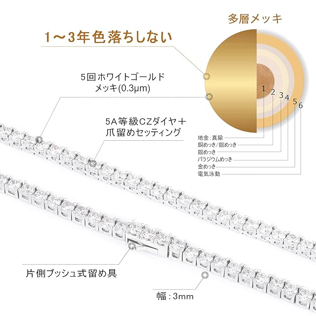 【しっかりした作り】素材は展延性に優れる真鍮とホワイトゴールドのメッキ加工。5回もメッキ(0.3μm)をかけているため、耐食性にも優れ、汗などの影響を受けにくく、日常使用ではほとんど黒ずみや変色の心配はありません。