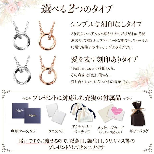 【 商品詳細 】メンズネックレス:チェーンの長さ 50cm、アジャスター 5cm、重量4g、レディースネックレス:チェーンの長さ 40cm、アジャスター 5cm、重量3g、共通事項 素材:スターリングシルバー、キュービックジルコニア、付属品:Nicoiro 専用ケース×2、お手入れ用クロス×2、アクセサリーポーチ×2、メッセージカード×1、ギフトバッグ×1、シルバーアクセサリーガイドブック