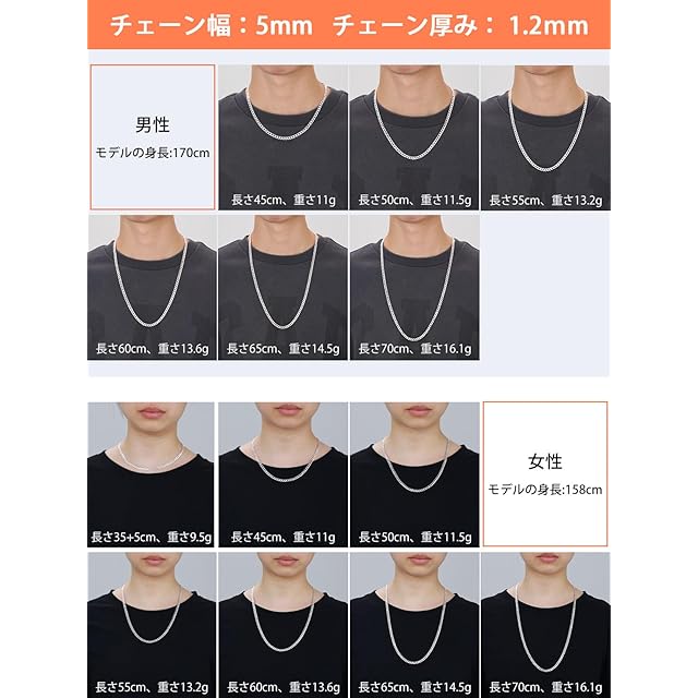 [チェーンネックレス] ネックレスチェーンの幅は約3mmと5mmがあり、チェーンの長さは長さは40cm(35cm+5cm)、45cm、50cm、55cm、60cm、65cm、70cmの7種類をお選びいただけます。