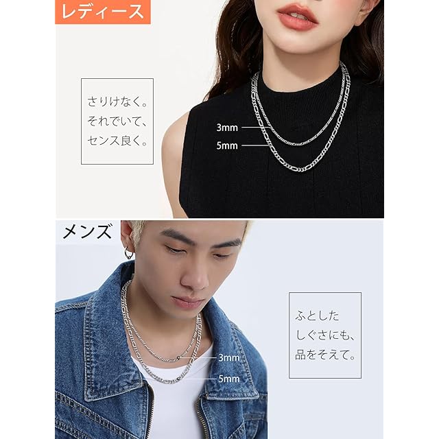 [チェーンネックレス] ネックレスチェーンの幅は約3mmと5mmがあり、チェーンの長さは長さは40cm(35cm+5cm)、45cm、50cm、55cm、60cm、65cm、70cmの7種類をお選びいただけます。