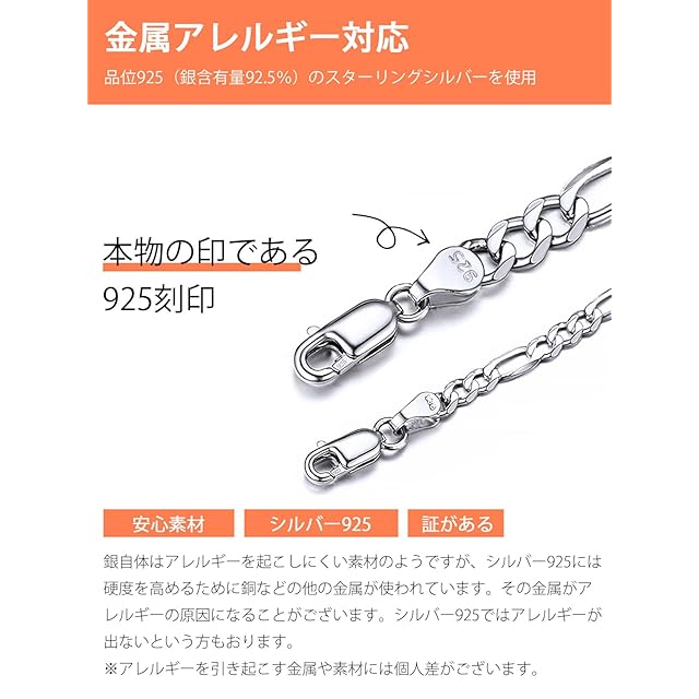 商品名:《新品未開封》[Silvora] シルバー925 ネックレス メンズ チェーンのみ 金属アレルギー レディース フィガロチェーン 50cm 幅3mm アクセサリー
