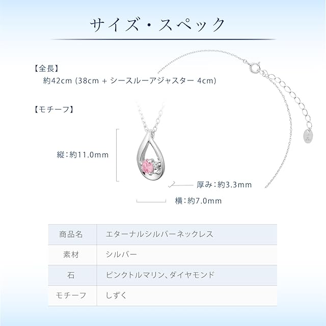 変色しにくいオリジナル素材「エターナルシルバー」を使用したネックレス。人気のしずくモチーフに10月の誕生石のトルマリンとダイヤモンドが煌めき、清楚で上品な印象に。ベーシックなデザインながらもほどよい存在感があり、コーディネートのアクセントになるデザインです。※天然石を使用しているため、実際の色味や風合いが異なる場合がございます。