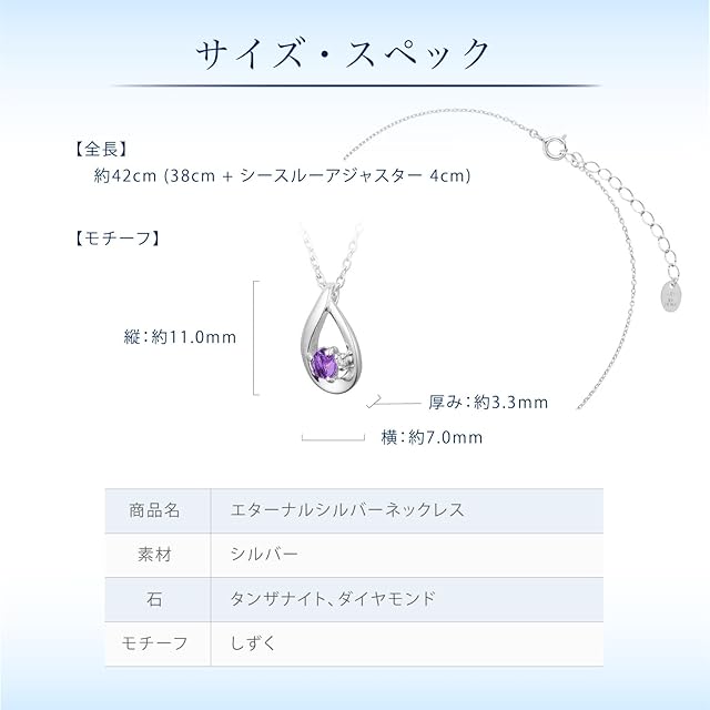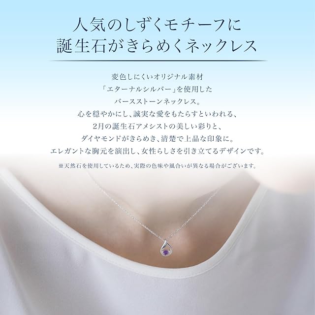 変色しにくいオリジナル素材「エターナルシルバー」を使用したネックレス。人気のしずくモチーフに2月の誕生石のアメシストとダイヤモンドが煌めき、清楚で上品な印象に。ベーシックなデザインながらもほどよい存在感があり、コーディネートのアクセントになるデザインです。※天然石を使用しているため、実際の色味や風合いが異なる場合がございます。