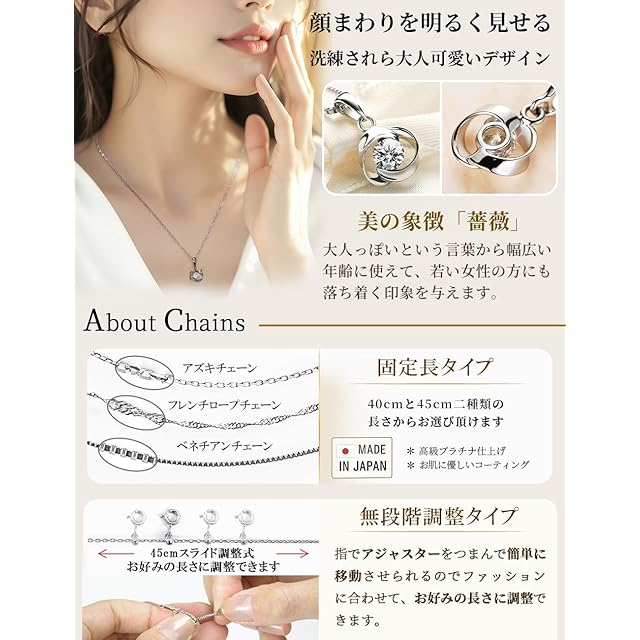 上品で大人可愛い雰囲気を演出する薔薇モチーフのネックレス レディース。 輝きの秘密は、ダイヤモンドのように美しい光を放つスワロフスキー ジルコニア。洗練されたデザインと高品質な素材の組み合わせが、普段使いから特別なシーンまで、胸元を華やかに彩ります。 本体には925スターリングシルバーを採用しており、変色しにくく肌にも優しい仕上がり。長く愛用できるネックレス レディースとして、年代を問わず幅広い方におすすめです。オフィスやデート、女子会、パーティーなどさまざまなシーンで活躍し、シンプルながらも存在感を放ちます。 また、大切な人へのプレゼントとしても最適。誕生日、記念日、クリスマス、バレンタインデー、ホワイトデーなど、特別な日をより一層思い出深いものにしてくれます。彼女や奥様、友人への贈り物として喜ばれる逸品です。 商品は高級感のある専用ボックスに入れてお届けしますので、ラッピング不要でそのままプレゼントとしてお渡しいただけます。さらに【90日間の品質】が付いているため、万が一不具合があった場合も安心してご利用いただけます。 スワロフスキー ジルコニアの輝きとシルバーの上品さが融合した、特別なレディースネックレス 。自分へのご褒美にも、大切な人への贈り物にもぴったりのアイテムです。