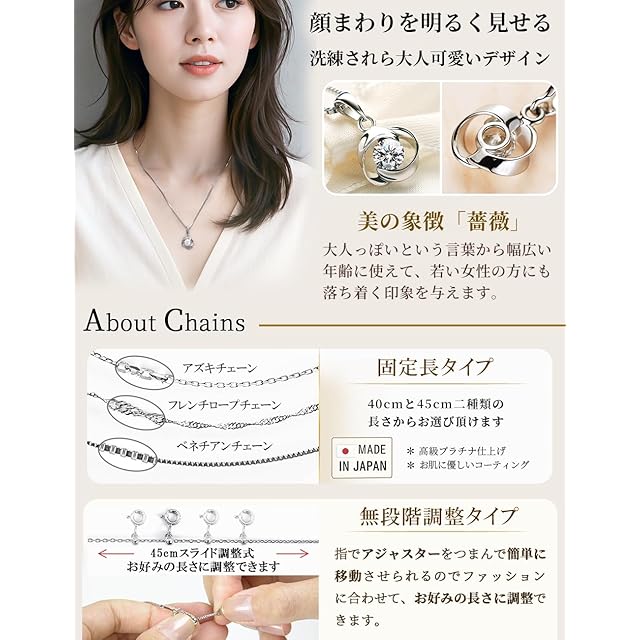 上品で大人可愛い雰囲気を演出する薔薇モチーフのネックレス レディース。 輝きの秘密は、ダイヤモンドのように美しい光を放つジルコニア。洗練されたデザインと高品質な素材の組み合わせが、普段使いから特別なシーンまで、胸元を華やかに彩ります。 本体には925スターリングシルバーを採用しており、変色しにくく肌にも優しい仕上がり。長く愛用できるネックレス レディースとして、年代を問わず幅広い方におすすめです。オフィスやデート、女子会、パーティーなどさまざまなシーンで活躍し、シンプルながらも存在感を放ちます。 また、大切な人へのプレゼントとしても最適。誕生日、記念日、クリスマス、バレンタインデー、ホワイトデーなど、特別な日をより一層思い出深いものにしてくれます。彼女や奥様、友人への贈り物として喜ばれる逸品です。 商品は高級感のある専用ボックスに入れてお届けしますので、ラッピング不要でそのままプレゼントとしてお渡しいただけます。さらに【90日間の品質】が付いているため、万が一不具合があった場合も安心してご利用いただけます。 ジルコニアの輝きとシルバーの上品さが融合した、特別なレディースネックレス 。自分へのご褒美にも、大切な人への贈り物にもぴったりのアイテムです。