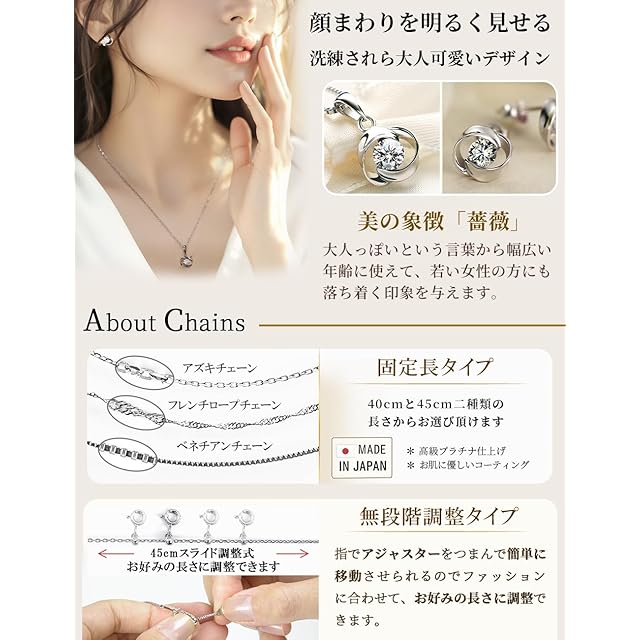 上品で大人可愛い雰囲気を演出する薔薇モチーフのネックレス レディース。 輝きの秘密は、ダイヤモンドのように美しい光を放つスワロフスキー ジルコニア。洗練されたデザインと高品質な素材の組み合わせが、普段使いから特別なシーンまで、胸元を華やかに彩ります。 本体には925スターリングシルバーを採用しており、変色しにくく肌にも優しい仕上がり。長く愛用できるネックレス レディースとして、年代を問わず幅広い方におすすめです。オフィスやデート、女子会、パーティーなどさまざまなシーンで活躍し、シンプルながらも存在感を放ちます。 また、大切な人へのプレゼントとしても最適。誕生日、記念日、クリスマス、バレンタインデー、ホワイトデーなど、特別な日をより一層思い出深いものにしてくれます。彼女や奥様、友人への贈り物として喜ばれる逸品です。 商品は高級感のある専用ボックスに入れてお届けしますので、ラッピング不要でそのままプレゼントとしてお渡しいただけます。さらに【90日間の品質】が付いているため、万が一不具合があった場合も安心してご利用いただけます。 スワロフスキー ジルコニアの輝きとシルバーの上品さが融合した、特別なレディースネックレス 。自分へのご褒美にも、大切な人への贈り物にもぴったりのアイテムです。