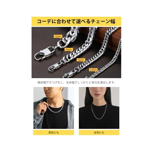 【色も!太さも!長さも選べる!】3.5mm、6mm、9mm、12mmの4太さ、シルバー、ゴールド、ブラックの3色、46cm、51cm、56cm、61cm、66cm、71cm、76cm、91cmの8長さ、全72種類を揃えました!