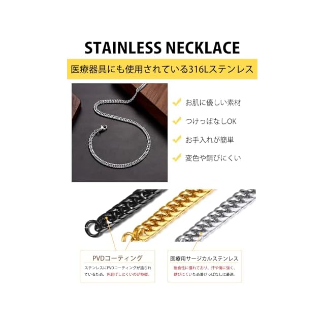 【ステンレスネックレス】地金はステンレスを採用。「錆びにくい」「アレルギー反応を起こしにくい」ので、お肌に優しい素材として人気です。