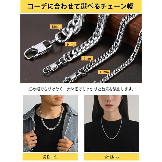 【色も!太さも!長さも選べる!】3.5mm、6mm、9mm、12mmの4太さ、シルバー、ゴールド、ブラックの3色、46cm、51cm、56cm、61cm、66cm、71cm、76cm、91cmの8長さ、全72種類を揃えました!