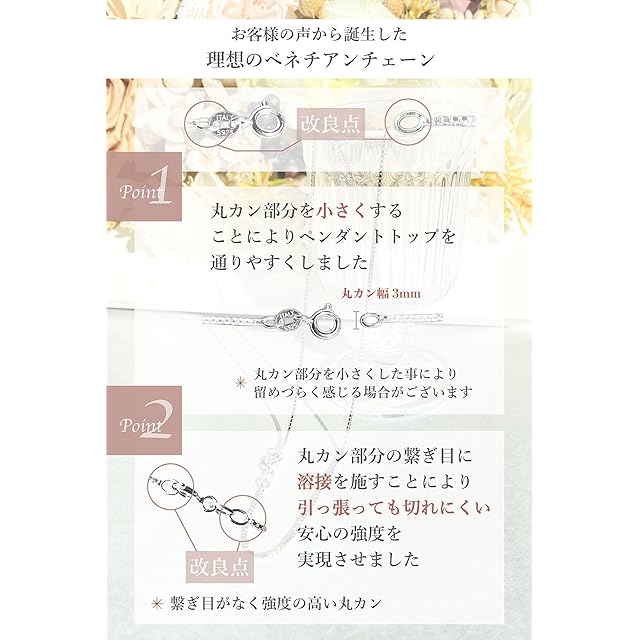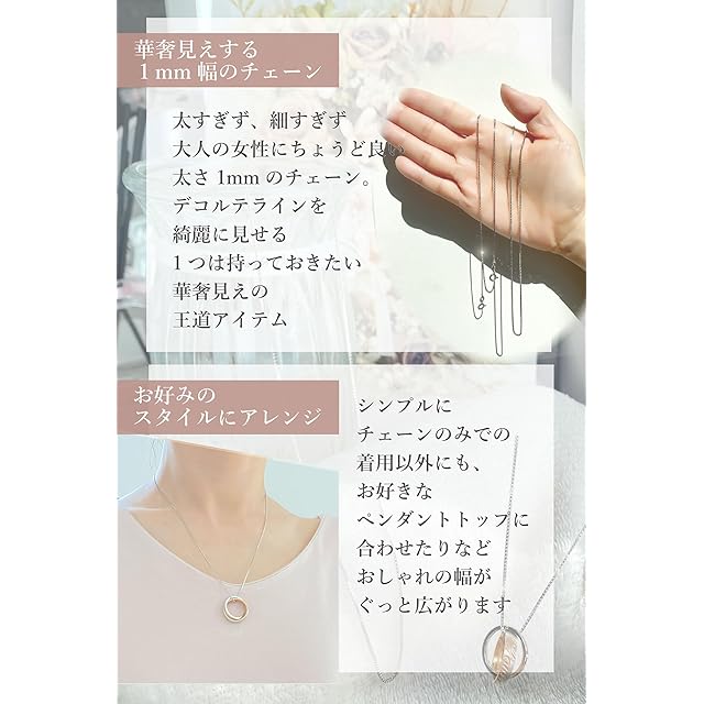 【高品質ロジウムコーティング】シルバー925素材のチェーンを、強度が高いロジウムコーティングで保護。シルバーアクセの弱点である「水・キズ・黒ずみ」から守り、毎日の使用にも耐えられる耐久性を実現しました。シルバーの変色もありませんのでお手入れ不要。いつでもプラチナのような美しく輝くチェーンをご着用いただけます。又、ロジウムはアレルギー性の極めて低い素材です。コーティングなしのシルバーチェンは白に近い色ですが、ロジウムコーティングのチェーンは銀色に近いプラチナのような光沢が楽しめます。あまりにも白すぎるチェーンを敬遠される大人の女性に支持されています。