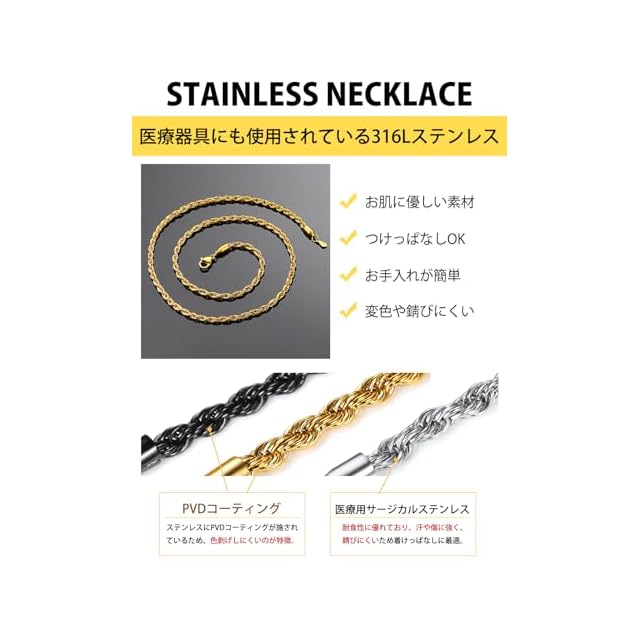 《新品未開封》[ChainsHouse] ネックレス メンズ チェーンのみ ステンレス フレンチロープチェーン ゴールド k18金 50センチ 3ミリ レディース アクセサリー
