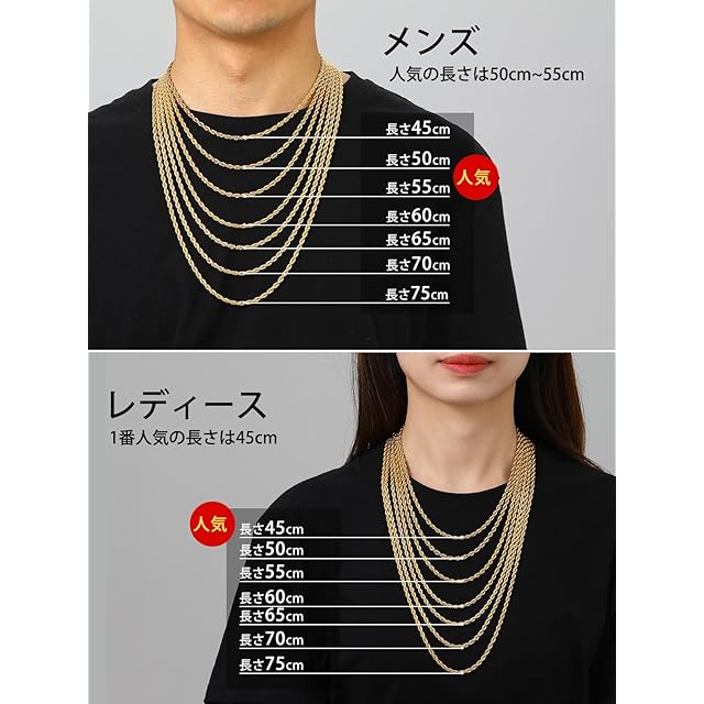 【色も!太さも!長さも選べる!】1.5mm、2mm、3mm、3.8mm、6mmの5太さ、シルバー、ゴールド、ブラックの3色、40cm、45cm、50cm、55cm、60cm、65cm、70cm、75cmの8長さ、全114種類を揃えました!