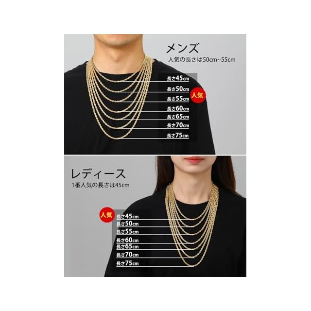 【色も!太さも!長さも選べる!】1.5mm、2mm、3mm、3.8mm、6mmの5太さ、シルバー、ゴールド、ブラックの3色、40cm、45cm、50cm、55cm、60cm、65cm、70cm、75cmの8長さ、全114種類を揃えました!