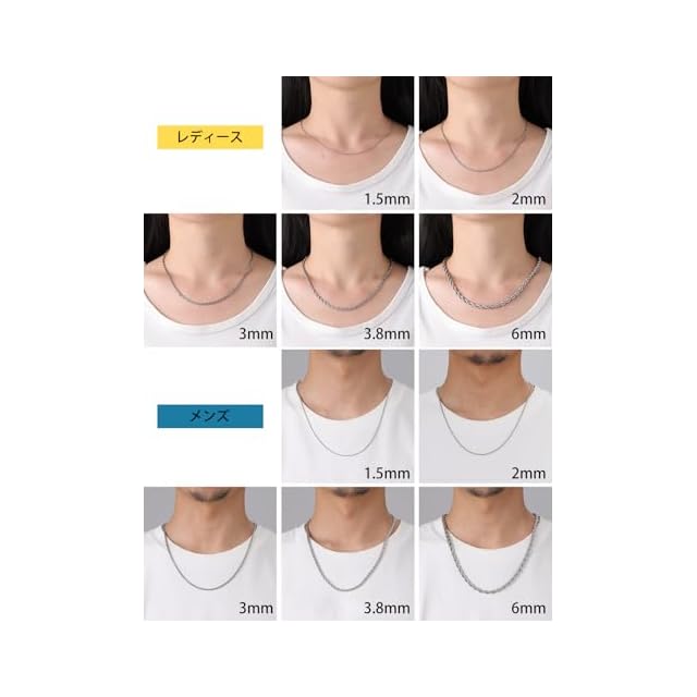 【色も!太さも!長さも選べる!】1.5mm、2mm、3mm、3.8mm、6mmの5太さ、シルバー、ゴールド、ブラックの3色、40cm、45cm、50cm、55cm、60cm、65cm、70cm、75cmの8長さ、全114種類を揃えました!